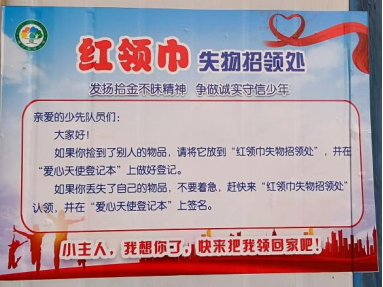 相信在我们大手牵小手的一起努力下,博才中海小学会变成一个“无遗”的和谐校园。通过失物招领志愿活动,有效地解决了捡到物品无处安置和物品丟了无处寻找的问题;也可以通过这一活动的开展,彰显拾金不昧、乐于助人的精神。引导我们祖国的花朵向善、向美;同时,也是对拾者“诚信”的一种考验。