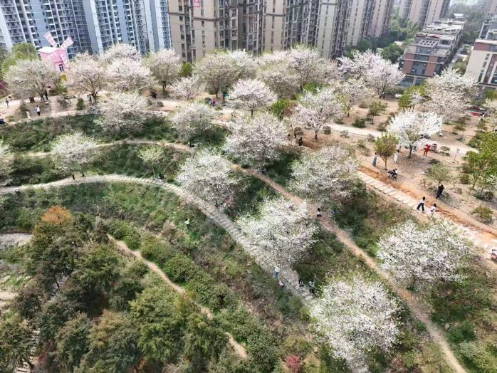 在学院领导的悉心指导下,学生们成功拍摄出了令人惊叹的画面。当无人机的嗡鸣声掠过花枝头,螺旋桨卷起的细碎花瓣如星尘般悬浮在晚风里,粉白的花影在镜头中定格成永恒。一位首次尝试无人机拍摄的学生激动地说:“原来从天空看花林像流动的粉色河流,这种震撼只有无人机能实现!”