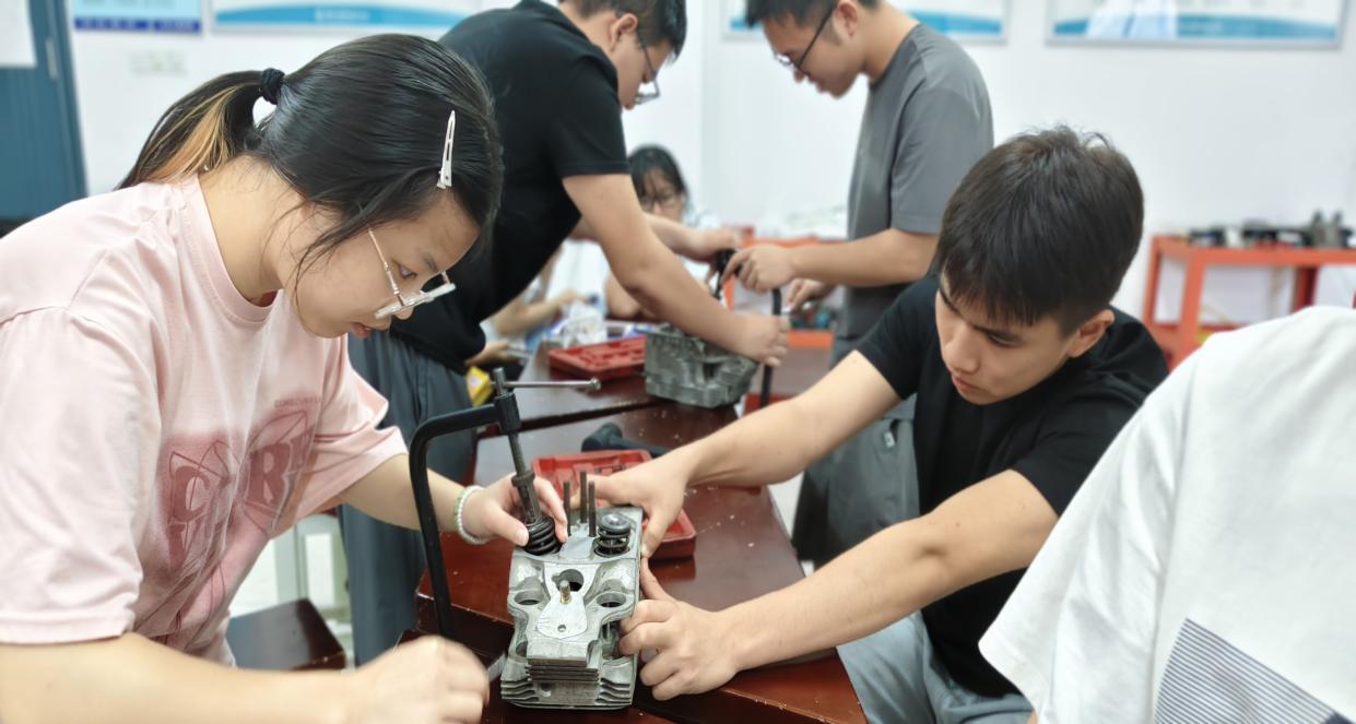 比赛现场,选手们需在限定时间内完成气门规范拆解与精准装配。评委从操作流程、工具使用、安全规范及装配质量等专业维度打分。工程24-1班夏正权凭借对工具使用的娴熟把控和流程优化,以3分04秒的成绩摘得桂冠;同班级的郑端辉紧随其后,用时3分54秒,获得第二名。参赛选手胡佳怡在赛后分享道:“这不仅需要扎实的理论基础,更考验临场应变能力与个人技能的娴熟度,每个环节都容不得半点疏忽。”