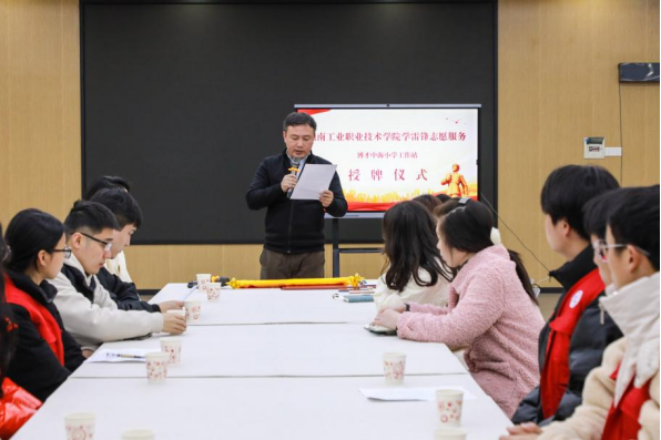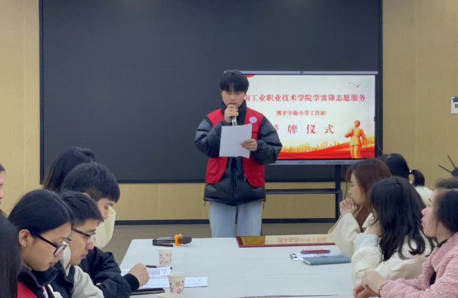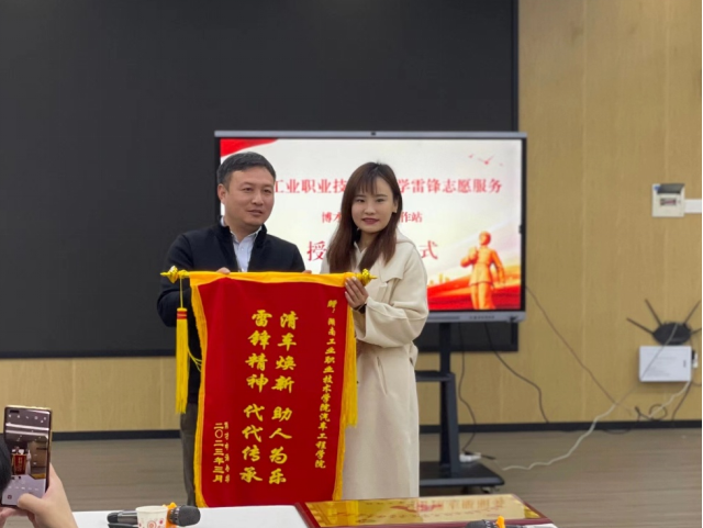 博才中海小学校领导就公益洗车志愿活动为汽车工程学院副书记涂岭授予锦旗,并对工业职院的领导及志愿者表示衷心的感谢。接着由电子pg游戏平台下载团委副书记向博才中海小学和汽车工程学院领导授牌。至此,电子pg游戏平台下载学雷锋志愿服务博才中海小学工作站正式成立,我校将以此平台全方位为博才中海小学开展志愿服务。