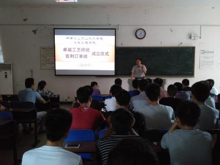 为推进应用型人才的培养模式改革,深化校企合作,充分发挥学校与企业的双方优势,6月27日下午,汽车工程学院2016级吉利订单班与卓越工艺师班成立仪式在第二教学楼104教室举行。汽车工程学院院长何忆斌、汽运教研室主任易宏彬、部分专业课教师、2016级学生辅导员以及全体吉利订单班与卓越工艺师班学生出席成立仪式。仪式由李琼老师主持。
