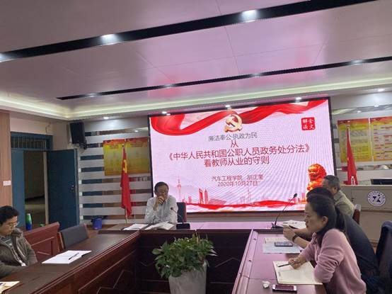 为进一步加强学院党风廉政建设,强化教职工的廉政意识,11月17日,汽车工程学院在党员活动室开展了党章党纪党规测试与党风廉政案例宣讲活动。学院党总支书记胡正奎主讲,学院全体教职工参加此次活动。