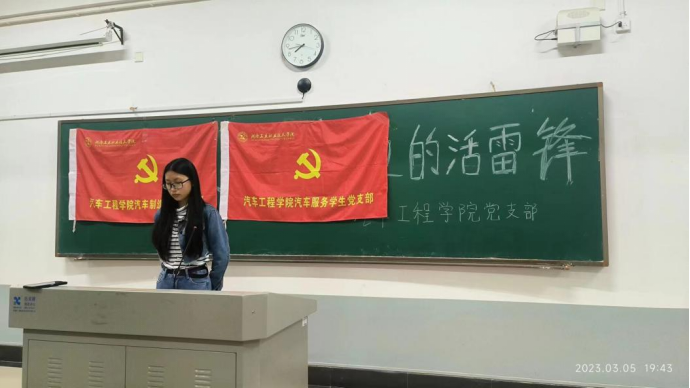 学雷锋精神,树校园新风。为纪念毛泽东同志“向雷锋同志学习”题词60年,认真学习雷锋同志先进事迹。3月5日,汽车工程学院党支部组织的主题党日活动——“每个人都是身边的活雷锋”在知行楼2102b教室举行。此次活动由汽车工程学院党支部工作组成员李志涛和刘俣含共同主持,支部49名同学共同参加。