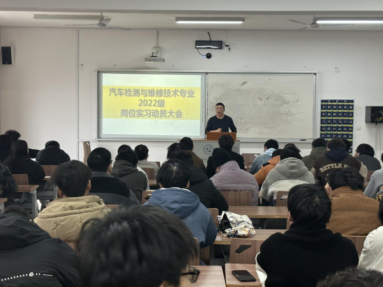 顶岗实习是学生职业能力培养的关键教学环节,是深化“工学结合”人才培养模式、强化学生职业素质教育和学校教育与企业文化相结合的良好途经。为做好2022级毕业生的顶岗实习工作,汽车检测与维修技术专业于2024年12月6日在汽车工程大楼508教室召开了2022级毕业生顶岗实习动员大会。本次大会旨在全面部署和动员即将踏入工作岗位的2022级学生,确保他们能够以饱满的热情和扎实的技能迎接岗位实习的挑战。