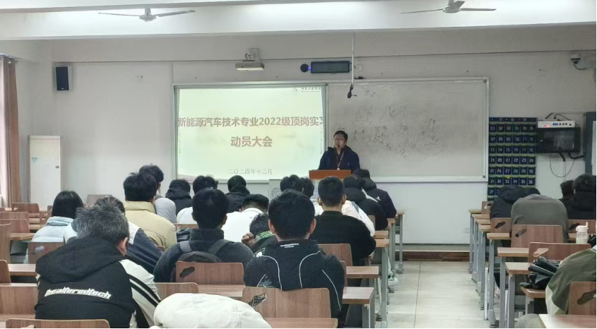 2024年12月6日,汽车工程学院在7508和7510教室召开了2022级新能源汽车技术专业顶岗实习动员大会。新能源汽车技术教研室相关指导老师和新能源汽车技术专业2022级全体学生参加了动员大会。