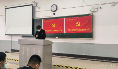 11月15日,汽车工程学院学生党支部在知行楼101教室组织召开2022年年度工作总结大会及十二期入党积极分子接收大会。会议由包亚涛主持,向朕总结。支部全体党员、预备党员、发展对象、入党积极分子共同参加了本次会议。