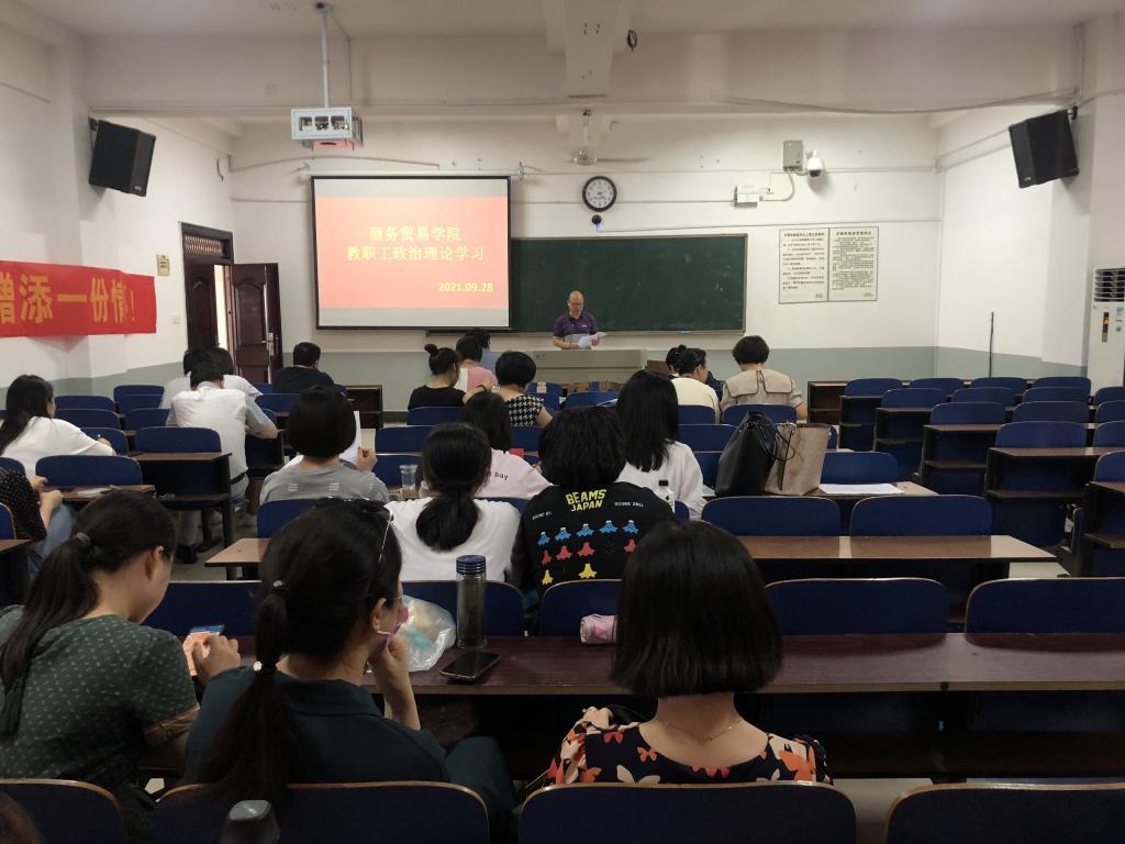 9月28日下午,商务贸易学院全体教职员工在2213教室开展了2021年9月政治理论集中学习,会议由学院党总支书记杨学文主持。