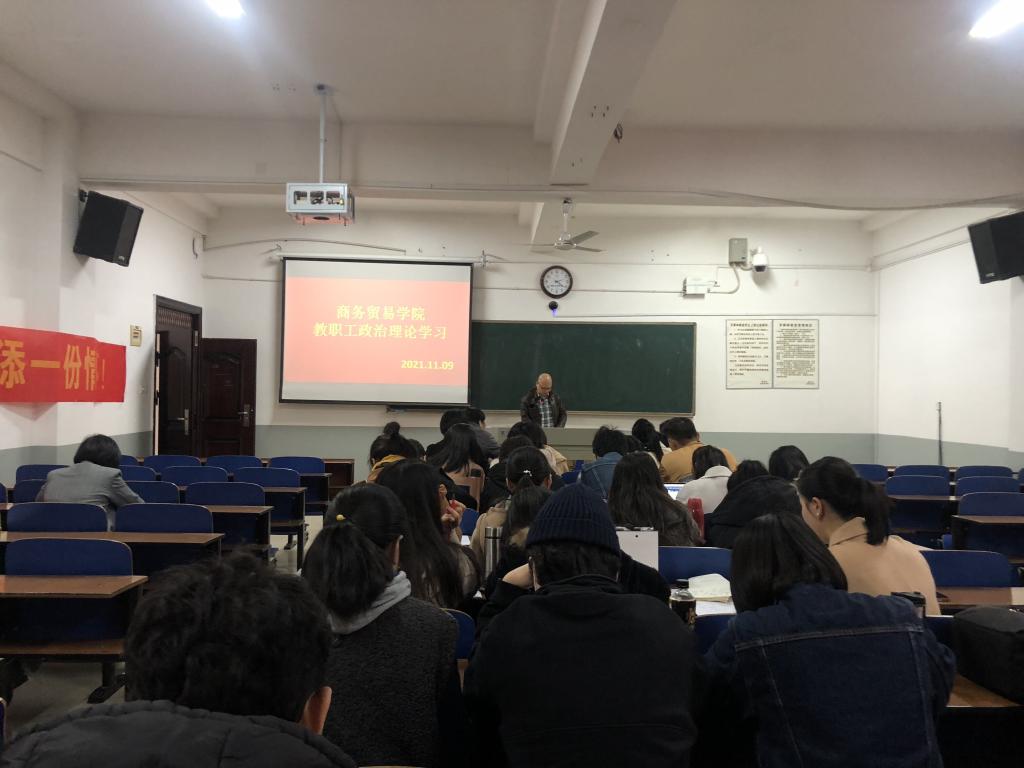 11月9日下午,商务贸易学院全体教职员工在2213教室开展了2021年11月政治理论集中学习,会议由学院党总支书记杨学文主持。