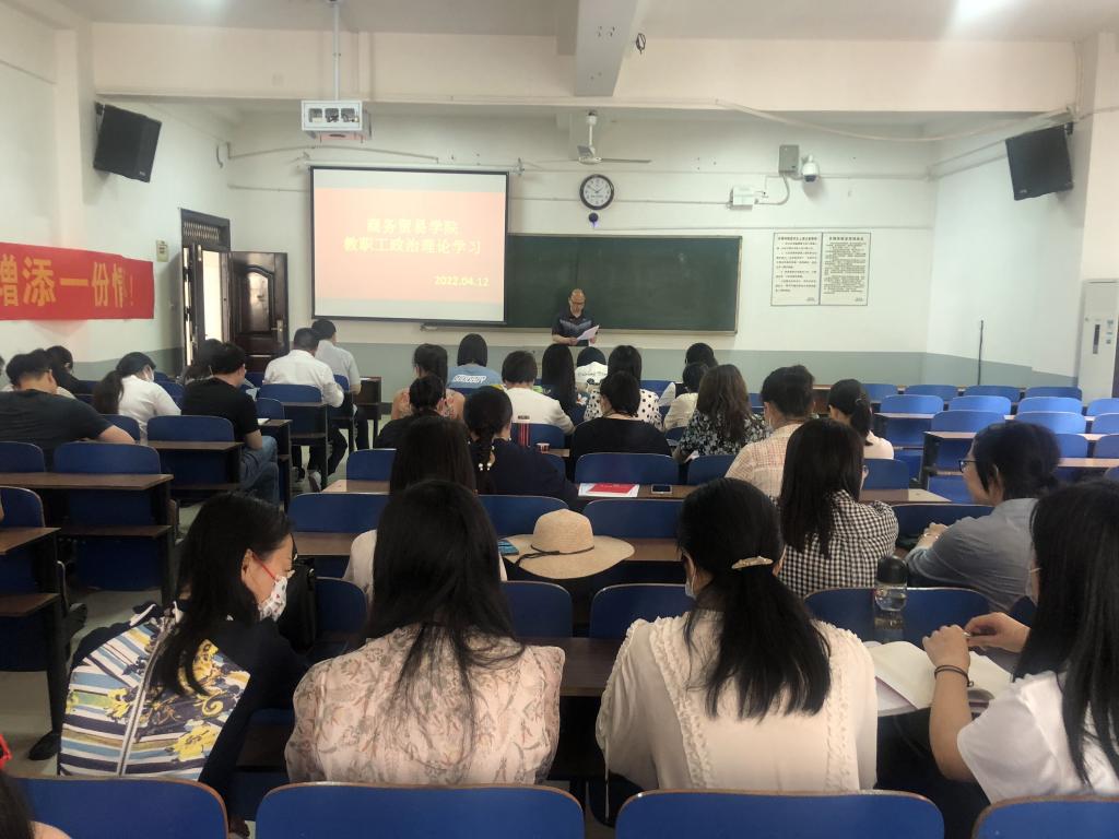 4月12日下午,商务贸易学院全体教职员工在2213教室开展了2022年4月政治理论集中学习,会议由学院党总支书记杨学文主持。