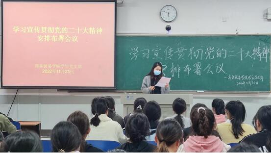 11月23日下午,为深入学习宣传贯彻党的二十大精神,商务贸易学院学生党支部召开学习宣传贯彻党的二十大精神安排部署会议,学生党支部书记刘超讲授“如何学习二十大精神”专题党课。商务贸易学院学生党支部全体学生党员参与本次会议。