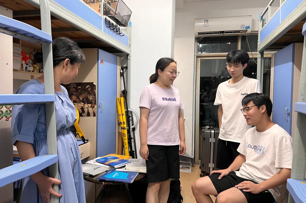 在走访过程中,段可一行与学生进行了亲切交谈。每到一处,他们首先向学生们致以新学期的问候,询问学生在宿舍生活中的具体情况,包括住宿条件、设施设备、生活习惯等方面。重点强调寝室安全用电、卫生状况等注意事项。鼓励学生积极营造一个安全、整洁的生活空间,为新学期的学习与生活奠定良好基础。