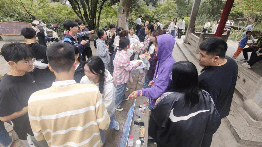 “遥知兄弟登高处,遍插茱萸少一人”“九月九日望乡台,他席他乡送客杯”在爱晚亭打卡点,学生们争先恐后背诵重阳诗句,完成挑战任务。“最近几天我一直在背诵有关重阳节和岳麓山的诗词,也让我进一步了解了重阳节这个传统节日的内涵和岳麓山的深厚底蕴。国商24-2班杨同学兴奋地展示自己的通关卡。