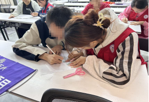 志愿者们通过协助同学们绘图,裁剪,上色,热塑,上亮油这五步操作,来教他们制作热缩片的手工艺制品。在志愿者们的细心指导以及同学们的细致操作下,最终顺利完成了热缩片的手工艺品的制作。