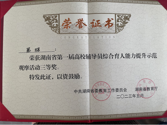 湖南省第一届高校辅导员综合育人能力提升示范观摩活动三等奖