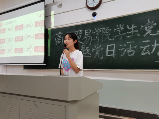 首先由商务贸易学院党支部入党积极分子代表向海燕介绍了入党相关事宜,经她的讲解后,同学们对申请入党的条件、入党流程以及之后的学习安排有了一个大概的了解。