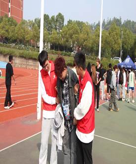 校运会伊始,志愿者们活跃在校园的各个角落,他们引导运动员前往比赛检录处 ,帮助他们按时参赛;他们在赛场周边打扫卫生,维持秩序,提醒观众注意安全;他们在终点处为运动员送上补给,引导他们休息。