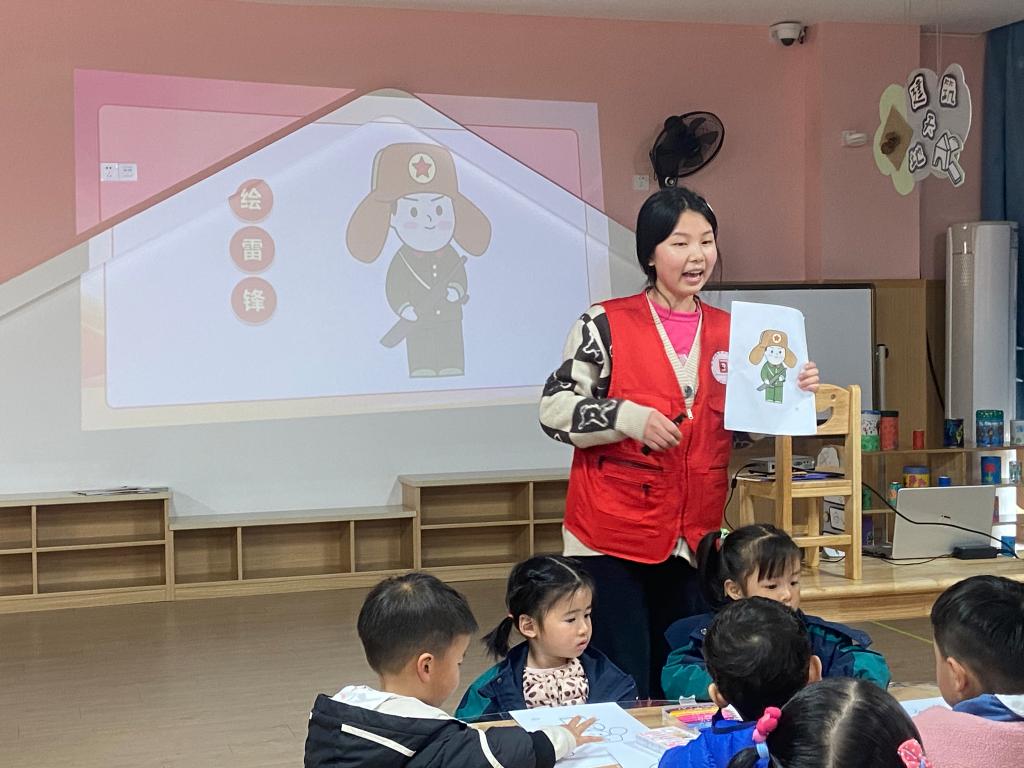 宣讲团成员们带领小朋友一起学唱《学习雷锋好榜样》手势舞歌曲,让小朋友们在歌声中感受雷锋精神的力量。青马社指导老师李玮羿为小三班赠送了红色故事绘本。
