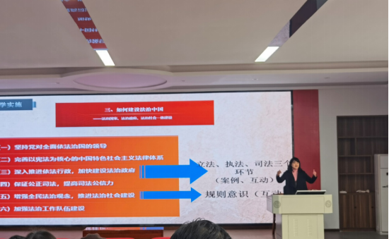 备课会上,张月老师结合党的二十大精神对“全面依法治国”专题做主题分享。她以热播剧《狂飙》为切入点,从全面依法治国的重要性、总目标以及措施三个方面展示本专题备课思路。并结合当前新闻热点和学生兴趣点,对学生应如何做好社会主义法治忠实崇尚者、自觉遵守者、坚定捍卫者等重点、难点问题进行阐释。其他参会教师结合自身实际,从案例选取、教学设计等方面进行充分交流和讨论。