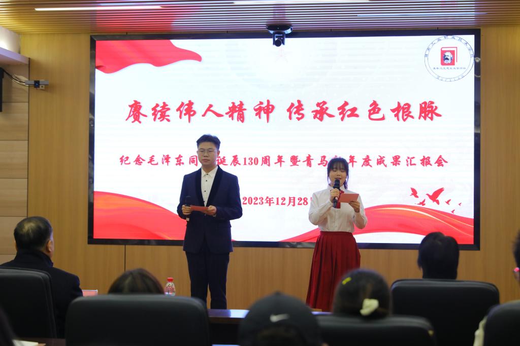 此次会议以“赓续伟人精神,传承红色根脉”为主题,活动分为两个部分进行,首先是青马社成果汇报。通过“我的青马足迹”视频展示了青马社社员及指导老师的成长历程。刘函同学在《恰同学少年》的读书分享环节中表达了从伟人故事中汲取学习动力与奋斗力量的决心。唐奡、涂华隆、田鑫三位同学《七律·人民解放军占领南京》的诗词朗诵和书法展示声情并茂地展现了诗中的革命精神、民族气节和家国情怀。吴凌峰同学则为大家带来了《终身的海军司令员—肖劲光》的红色故事,故事展现了革命先烈的英勇事迹。随后,社员罗晨、杨勇、陈远和、刘姝彤四位同学带来了《复兴颂》的朗诵,展现了新时代青年对复兴中华的坚定信念。最后,青马社红歌合唱团以饱满的热情演唱了红歌《太阳最红 毛主席最亲》,用歌声表达了对领袖的敬仰之情和传承红色基因的决心。