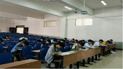 本竞赛以书面考试的形式举行,于下午两点准时开考,由监考人员收取各类电子设备,逐一分发试卷,考生开始作答,每一位同学都认真答题,争分夺秒,奋笔疾书。