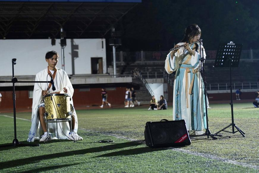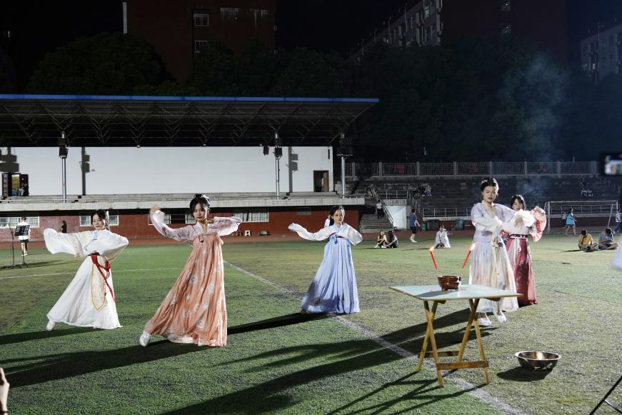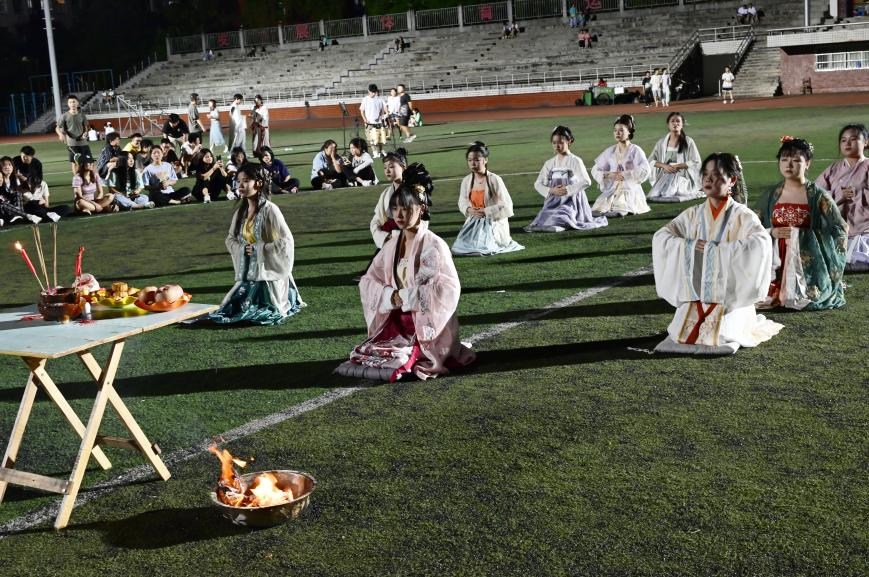 本次活动分为三部分:第一部分为制宫灯、制作月饼等手工活动。第二部分为中秋祭月仪式,同学们身着华服,陈设果品,举行祭月仪式。第三部分歌舞相庆,有古风作品《广寒宫》、《繁花》等。现场氛围浓厚,全校师生积极地参与到了现场活动的互动中。