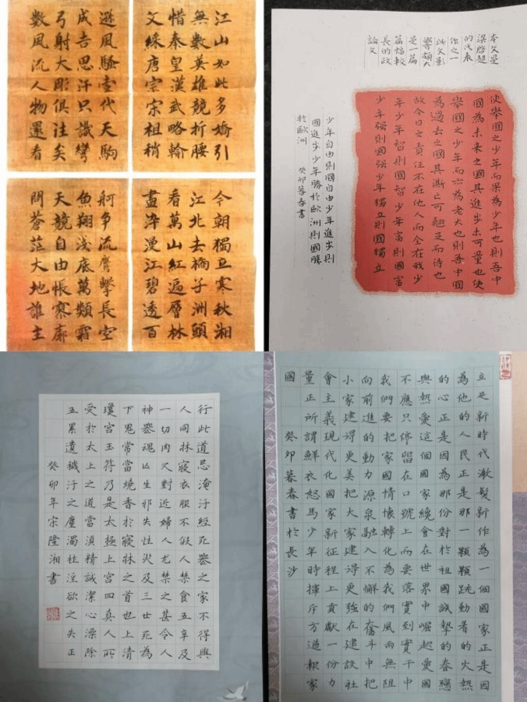 在比赛现场,参赛同学认真按照比赛要求书写体现家国情怀的自选内容,作品排版清晰,字迹工整,一笔一划都表达了学子们对家的眷恋与对国的自豪。比赛过程中涌现了许多优秀的作品,例如肖与同学的《沁园春·雪》、袁甜同学的《少年中国说》、宋隆湘同学的《灵飞经》以及吴景瑞同学的《做新时代奋进者》。