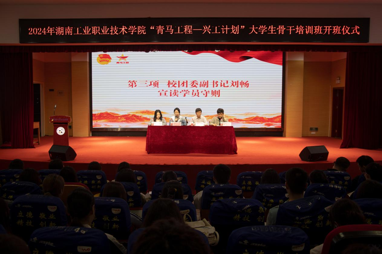 10月15日下午,电子pg游戏平台下载2024年“青年马克思主义者培养工程——兴工计划”大学生骨干培训班开班仪式在善尚楼1102举行。学校团委书记程涛、团委副书记刘畅、社团管理与实践科科长李可丁、各二级学院团总支书记、青马班培训学员等170人参加开班仪式。仪式由青马班班主任、校团委组织宣传科科长彭茜主持。
