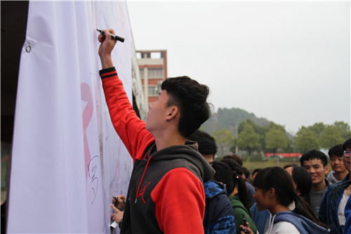 本次活动包括红丝带防艾跑、签名墙等两个内容。随着宣传干事们的积极宣传和同学们的热情参与,活动现场热闹非凡。在李陟威的带领签名下,在场学生依次排队在签名墙上留下自己的名字,并领取了红丝带和小礼品。