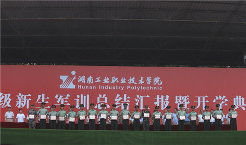 汇报表演结束后,副校长董建国宣读军训表彰决定,校领导为优秀教官、优秀连队、优秀个人代表颁发证书。