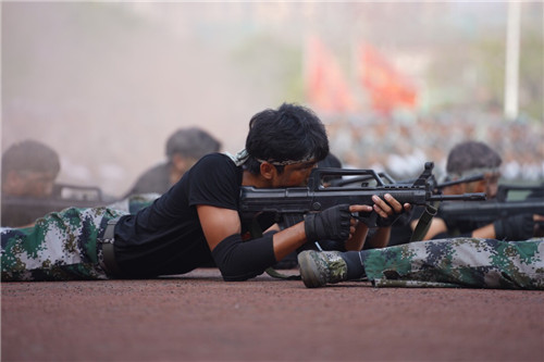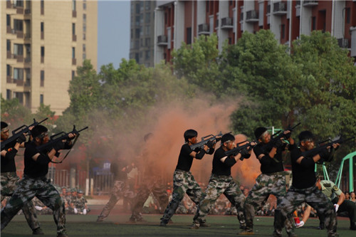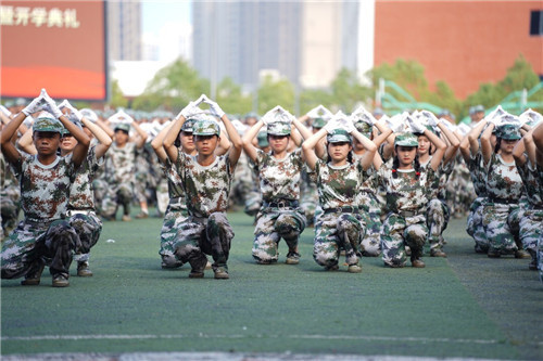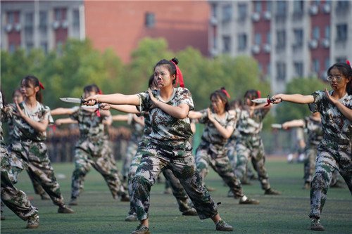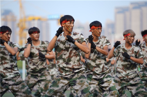 随后,由1200名学子组成的校园文化方阵摆出“请党放心,强国有我”“1921-2021”“九一八”“中国”等字样及“95式自动步枪”“党徽”“爱心”“中国版图”等图案,变换队列的同时高喊振奋人心的口号,表达了青年学子的爱国之心、强国之愿、报国之志。随后,军体拳方阵、匕首操方阵、水瓶方阵、战术方阵、大型方阵等特色方阵相继亮相,充分展示了刻苦拼搏的军训成果。