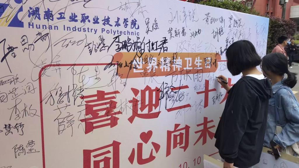 阳光明媚,秋高气爽,10月10日是第31个世界精神卫生日,为营造师生关注心理健康的良好氛围,学校组织开展了“喜迎二十大,同心向未来”为主题的心理健康教育宣传活动。主题活动包括千人签名、心理健康科普小知识海报展示、“爱的抱抱”快闪活动、“我听你心声”朋辈树洞营活动以及线上大学生心理适应专题讲座等。全校师生积极参与了活动。