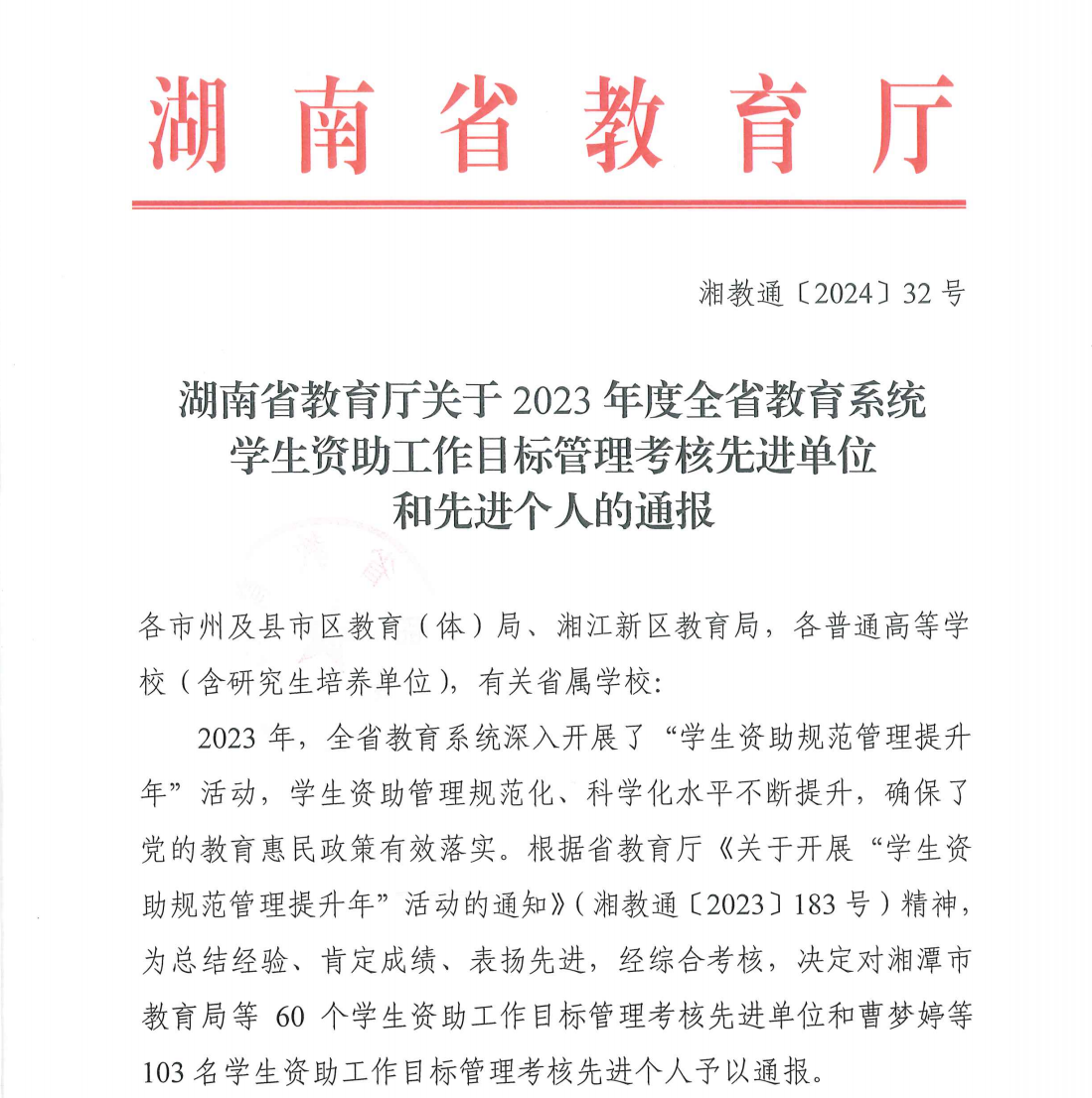 近日,湖南省教育厅发布《关于2023年度全省教育系统学生资助工作目标管理考核先进单位和先进个人的通报》(湘教通﹝2024﹞32号),我校获评“2023年度全省教育系统学生资助工作目标管理考核先进单位”,学生工作部姚丹丹老师获评“全省教育系统学生资助工作目标管理考核先进个人”。