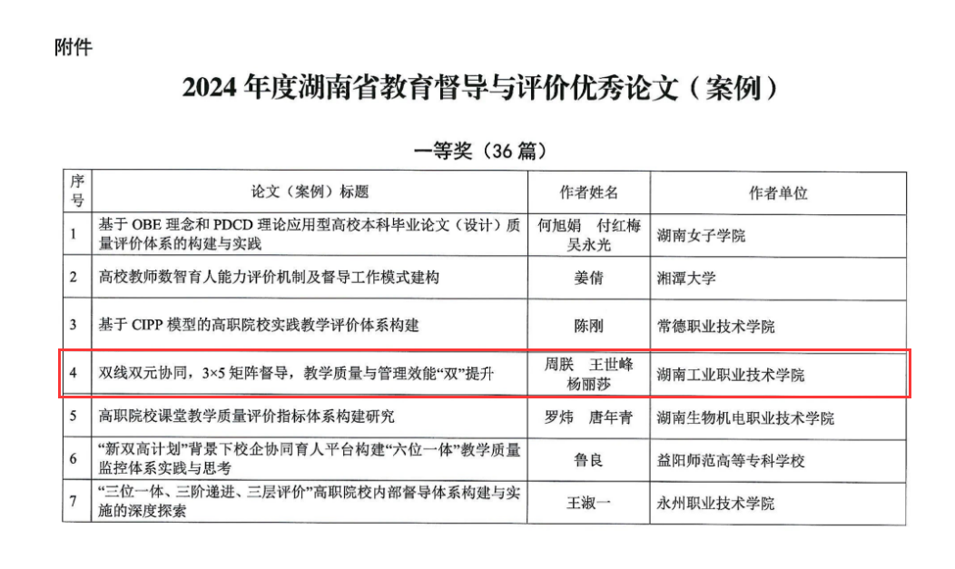 近日,湖南省教育厅发布《2024年度湖南省教育督导与评价优秀论文(案例)评选结果的通知》(湘教通〔2025〕99号)。本次评选活动征集参评论文(案例)904篇,评定获奖论文(案例)303篇,我校荣获一等奖1篇,三等奖2篇,位居省内高职院校前列。