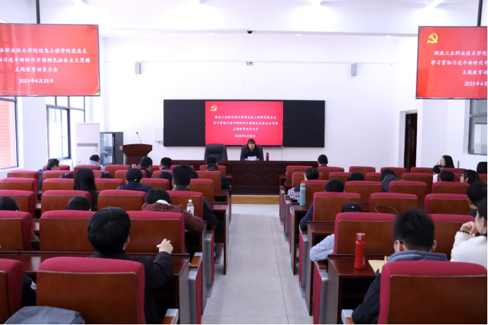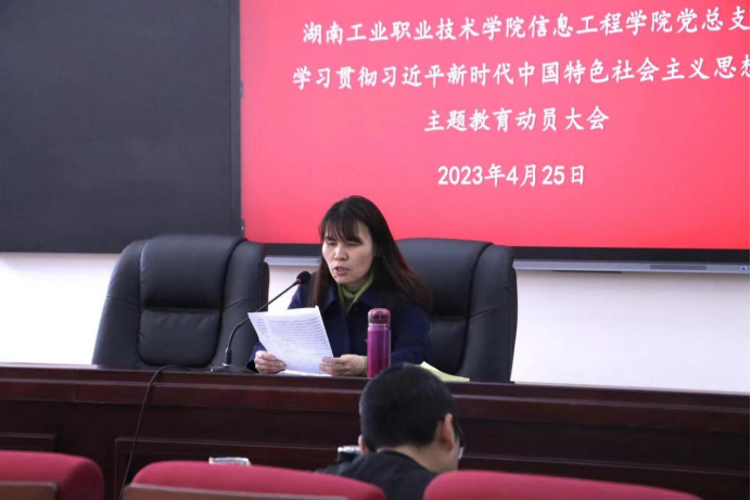 2023年4月25日下午,信息工程学院党总支在10-101召开学习贯彻习近平新时代中国特色社会主义思想主题教育动员大会,信息工程学院党支部书记廖佑莲主持动员大会并讲话。