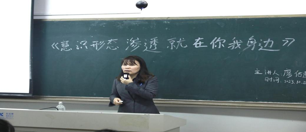廖佑莲围绕“意识形态概念”、“我国当前面临渗透挑战”、“西方意识形态渗透的政治阴谋”、“提升大学生自身的意识形态能力”四个方面论述意识形态;她强调,意识形态工作非常重要,我们要牢牢紧跟党的意识形态工作方向,时刻筑牢理想信念根基,同时告诉学生意识形态能力分为那些,如何不断提升大学生自身的意识形态能力;其次,通过深入剖析“美国以基金援助形式向中国学术界渗透价值观”等具体案例反映了我国当前面临的意识形态挑战。最后,她指出大学生党员是青年中的骨干力量,作为一名积极向党组织靠拢的新学员,在中华民族实现伟大复兴的道路上,要有自己的责任担当。