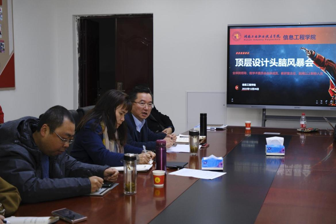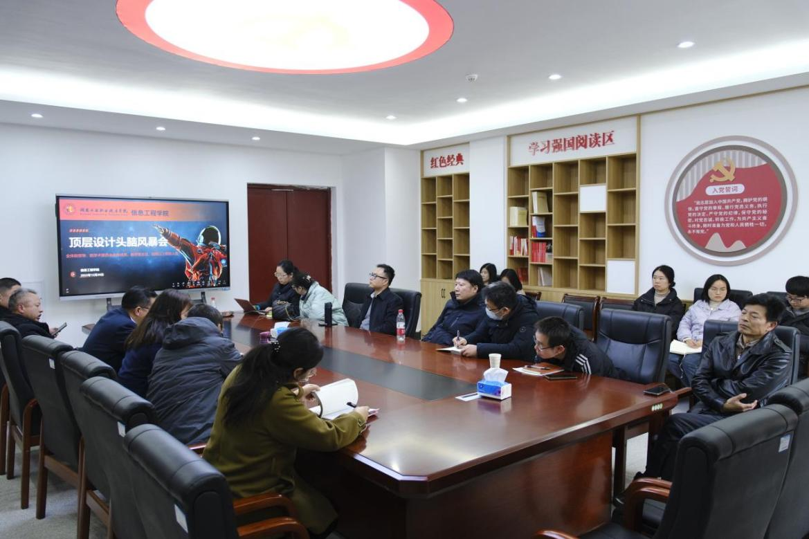 针对学院在高质量发展过程中遇到的一系列问题,信息工程学院于2023年12月27日下午,在敏行楼317会议室召开了学院顶层设计头脑风暴会,学院领导班子全体成员、各教研室主任、学院学术委员会全体成员、学院大师工作室全体成员、全体副高以上职称教师参加了本次会议,会议由信息工程学院院长王世峰主持。