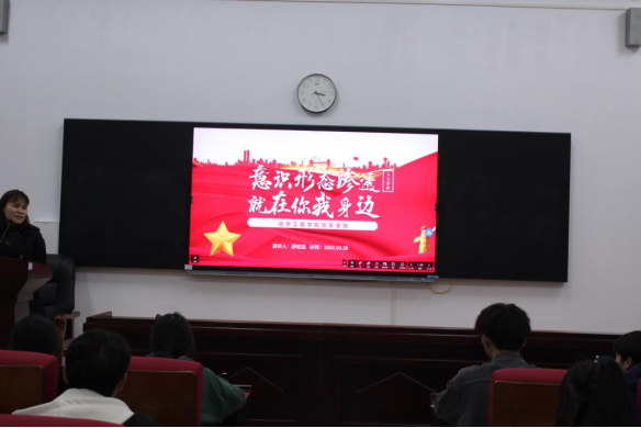 2024年3月28日晚上,信息工程学院第十四期入党积极分子培训班在10-104教室开展党课学习,信息工程学院党总支书记廖佑莲为全部初培班学员讲授“意识形态渗透,就在你我身边”主题党课。
