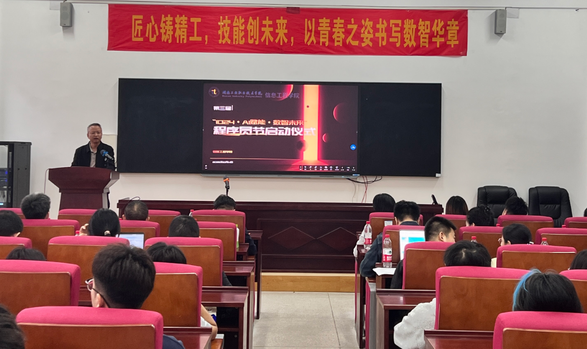 10月14日下午,信息工程学院于敏行楼10-101室举行第三届“1024程序员节”启动仪式。本届活动以“1024·AI赋能·数智未来”为主题,学院领导、企业嘉宾以及师生代表齐聚一堂,共同探讨人工智能时代的技术创新与人才培养问题。