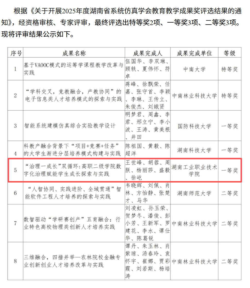会议同期公布了2025年度湖南省系统仿真学会教育教学成果奖评选结果。本次评选共收到来自全省本科及高职院校的二十余项申报成果,经严格评审,共评出特等奖2项、一等奖3项、二等奖3项。由我院院长王世峰主持完成的《“治理—成长”双循环:高职二级学院数字化治理赋能学生成长探索与实践》荣获一等奖,成为该奖项中唯一一项来自高职院校的获奖成果,彰显了我院在教育教学改革与数字化治理方面的实践成效。