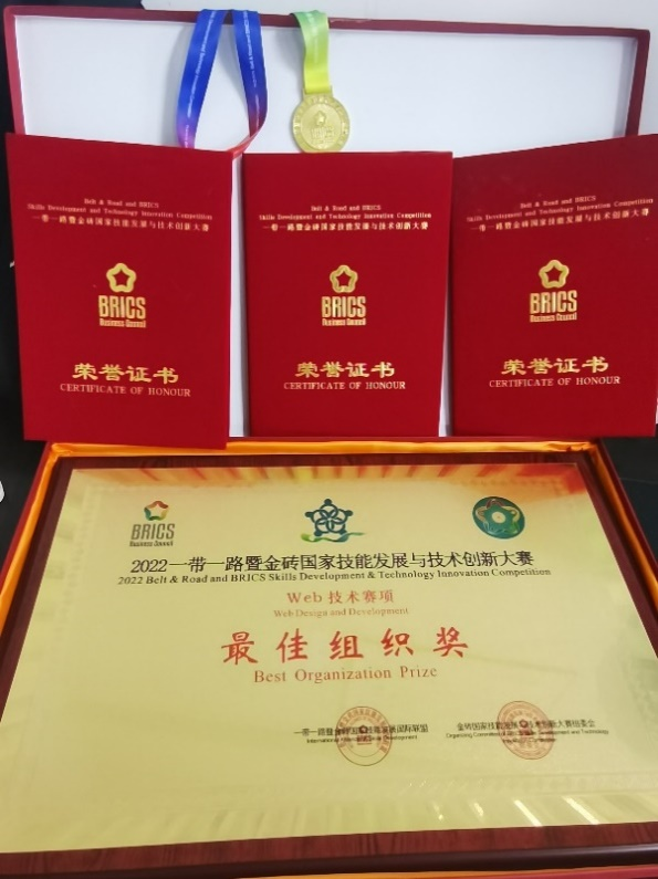 2022年5月6日,“2022年一带一路暨金砖国家技能发展与技术创新大赛Web技术赛项”在泸州职业技术学院成功举办。我校信息工程学院软件协会的谭越东同学荣获“一带一路暨金砖国家技能发展与技术创新大赛Web技术赛项”全国一等奖,入围了金砖五国职业院校学生大赛的国际赛决赛,刘志杰老师获优秀指导教师,湖南工职业技术学院获最佳组织奖。