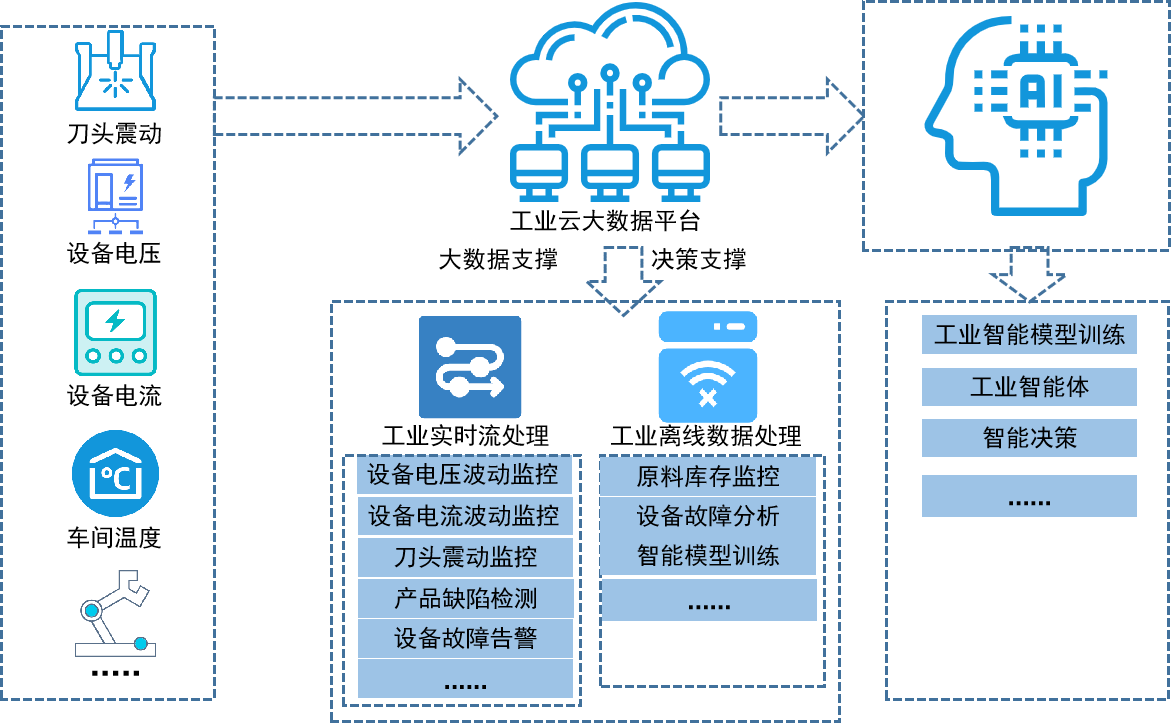 依托该仿真平台,对工业大数据采集与预处理、工业大数据存储、工业大数据处理分析与智能产品应用全链条进行覆盖。工业大数据采集将工业制造过程各个环节的数据进行采集与预处理(例如设备电压电流数据,刀头震动数据、室内温度数据等);采集到的数据将流入大数据平台,该平台中数据可以为后续的两大环节提供数据支撑:一是实时数据分析处理,用于监控设备电压电流波动情况、刀头震动情况、智能产品缺陷检测等;另一条是离线数据分析处理,用于对原料库存分析、设备故障预测分析等。