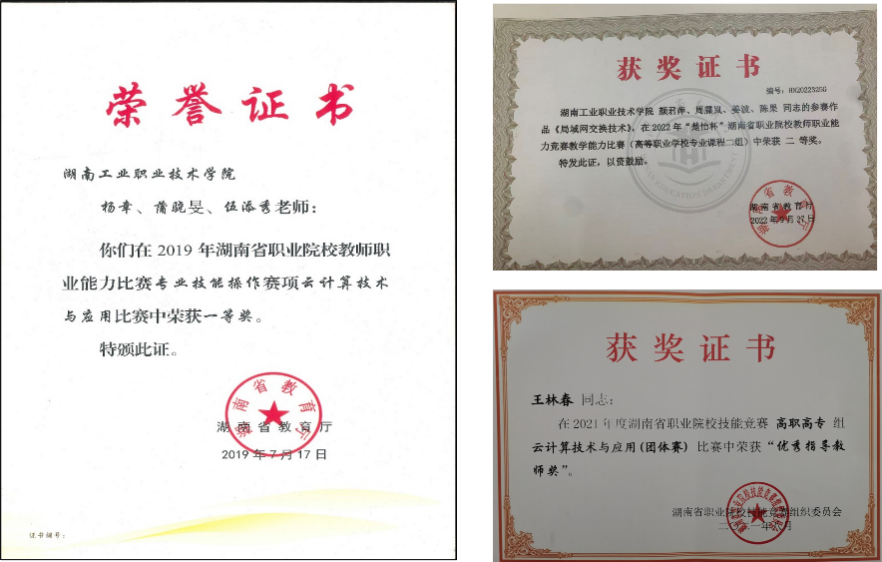 本专业在各级各类技能竞赛中表现突出,近年来在全国职业院校技能竞赛获三等奖3项,湖南省职业院校技能竞赛获一等奖 6项 、二等奖6项、三等奖7项;在华为全球ICT大赛获一等奖1项,二等奖2项、三等奖1项,华为、华三全国ICT大赛获一等奖2项;。