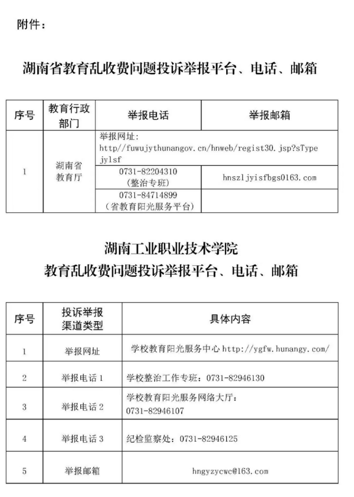 为持续推进学校贯彻落实全省教育乱收费问题专项整治工作,维护学生家长合法权益,现向社会公开我校教育乱收费问题线索投诉举报方式,投诉举报方式包括网络、电话、邮箱、信件等(详见附件)。