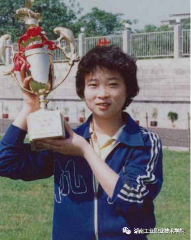 (我校模具专业8704班李玲捧回长沙地区 中专田径赛三连冠奖杯)