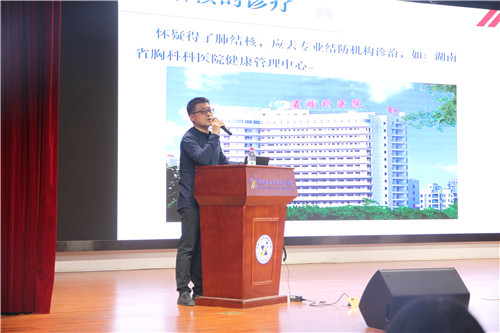 谭振主任从“结核的前世今生、学校结核病疫情概况、学校结核病的发病原因及特点、如何预防学校结核病”等方面进行讲解。“只有深入了解才能有效防治。”谭振主任重点讲述了结核病的主要症状以及防治,他介绍,引起结核病的“幕后黑手”之一的结核分支杆菌的细菌以及由它引起的慢性传染病——肺结核。为什么在校学生容易患结核病?谭振主任通过数据分析目前国内和我省学校结核病疫情情况,他认为学校是人口高密度场所,通风性较差,学生作息不规律等不良习惯极大的提高了患病的机率。最后,他就如何预防学校结核病提出以下三点建议:早期发现传染源,发现患者及时去治疗;切断传播途径,比如保持环境卫生,进行消毒;加强自身抵抗力,经常锻炼,坚持良好的作息习惯。