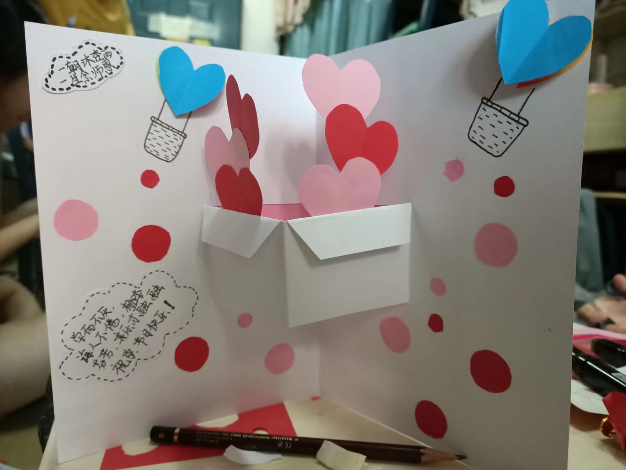 同学们别出心裁的设计使贺卡栩栩如生,大家用折纸、剪纸、绘画等方法,献上自己的感激与祝福,一朵花瓣、一片绿叶,饱含着浓浓敬意被设计成各种图案贴进贺卡里。同学们在贺卡上亲手写下了最美的文字,献给我们最敬爱的老师,表达对老师的感恩之情,感谢老师的默默耕耘、无私奉献,校园中处处洋溢着温馨而感人的庆祝氛围。
