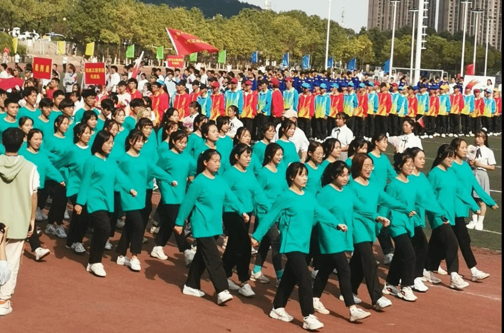 田径场内人头攒动、彩旗飘扬,伴随着振奋人心的《运动员进行曲》,各方阵队迈着整齐的步伐,喊着响亮的口号依次经过主席台接受检阅。