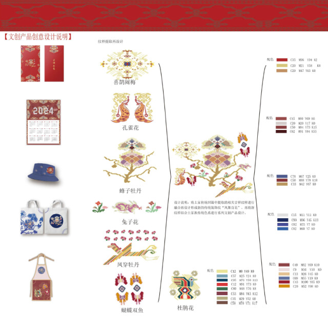 其中,孟娟老师带领广告专业3名学生根据土家织锦图纹中的图案元素设计了帽子、帆布包、红包等5款共计15种产品。团队成员、广告2021—3班学生项温馨介绍,从调研到后来的创意构思、草图绘制和完成插画设计,他们参考了6本湘西文化或设计相关书籍,反反复复修改了很多次。他们提取了土家织锦西兰卡普里“凤穿牡丹纹”中的凤纹、“孔雀花纹”中的孔雀纹、“鱼花”中的鱼纹、“珍兽图”中的麒麟纹等多种传统纹样,进行现代视觉化再设计,同时融入土家族摆手舞和土家族特有乐器“咚咚喹”等民族特色内容。“希望通过文创产品设计展现土家族人民对美好生活的热爱,从而让更多人了解到头车村土家族文化的魅力。”项温馨表示,能充分发挥专业所学,用设计技能助农兴农,这是一件很有意义的事情。