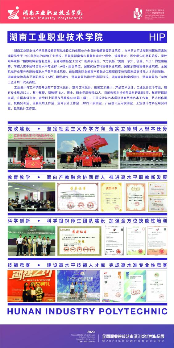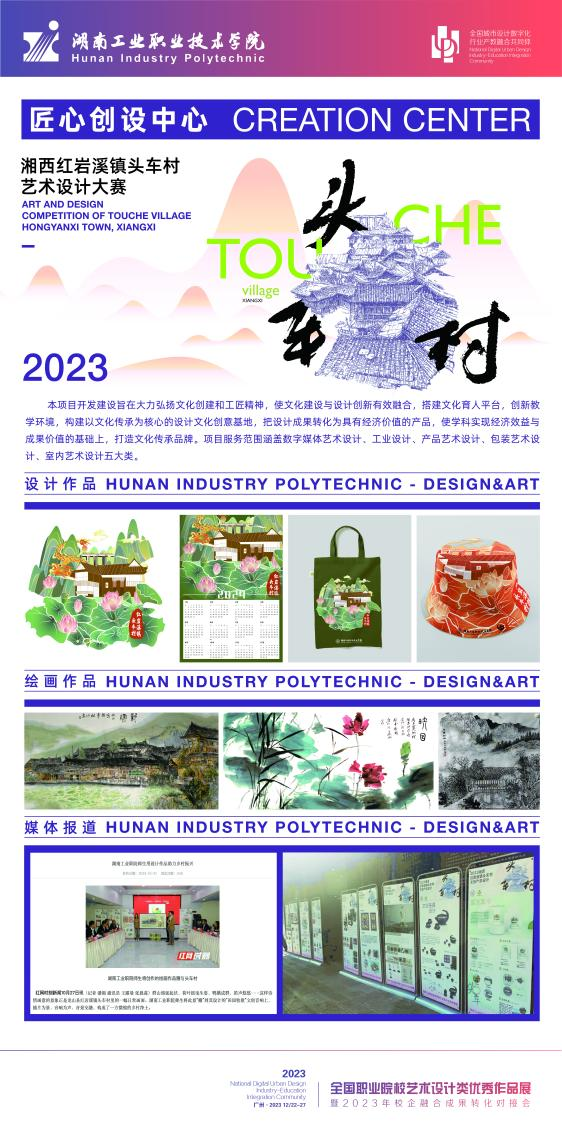 12月24日至26日,由教育部职业院校艺术设计类专业教学指导委员会主办的全国职业院校艺术设计类优秀作品展暨 2023年校企融合成果转化对接会在广州琶洲·灵感创新展馆举行,全国共有86所高职院校、10家企业参加此次成果转化对接会,电子pg游戏平台下载工业设计与艺术学院受邀参加展会,展会中关于湖南工业职院匠心创设中心在对口帮扶龙山县红岩溪镇头车村 “党建引领 精准施策”为主题的乡村振兴项目—湘西红岩溪镇头车村文创产品设计案例,获得了参展人员一致好评,其中相关成果转化设计作品及精准扶贫志愿服务项目受到高度赞扬。