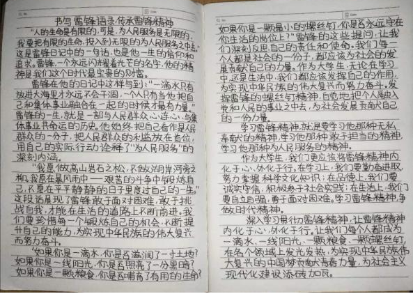 活动面向全校学生,要求参与者自选雷锋事迹、小说、电影台词等中传递正能量的片段进行摘抄。同学们认真阅读,挑选出自己喜欢的片段,用文字摘抄的形式传递雷锋精神。完成后,他们用拍照分享的方式交流读书笔记与阅读心得,展现出了工院学子积极向上的精神风貌。